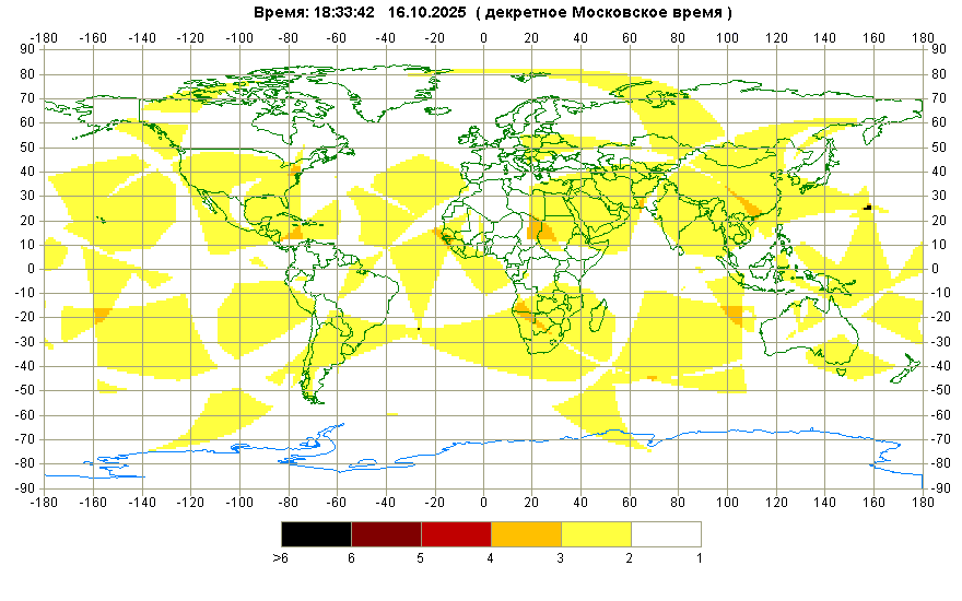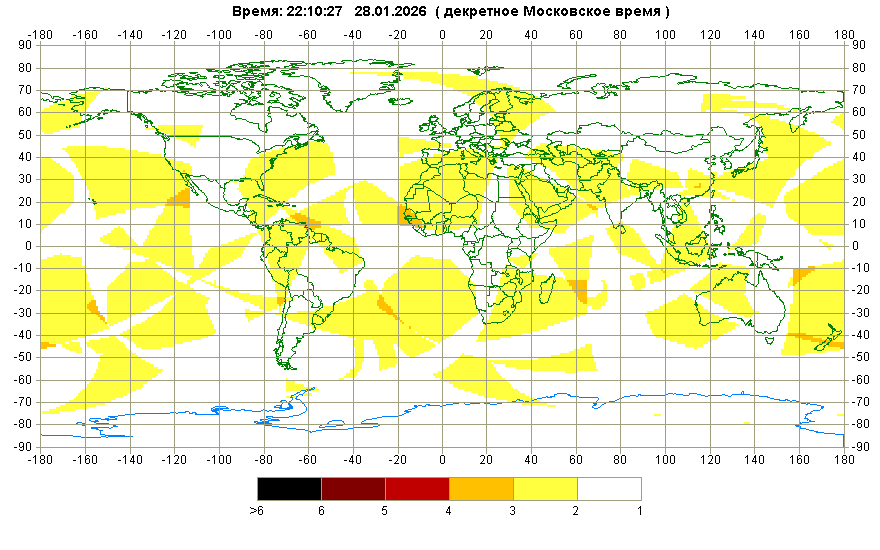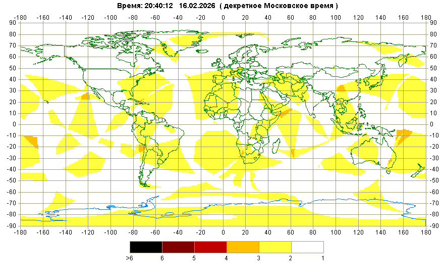 Значения позиционного геометрического фактора PDOP на текущий момент времени по земной поверхности (угол места ≥ 5 градусов)